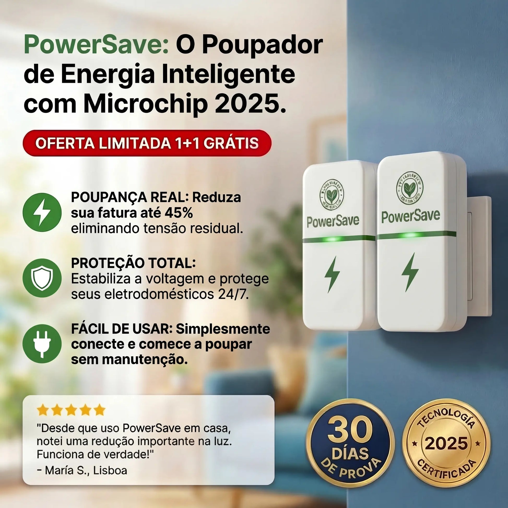 1 + 1 GRÁTIS | PowerSAVE™ – Elimina os picos de tensão e reduz a fatura da luz. *Sem necessidade de manutenção.