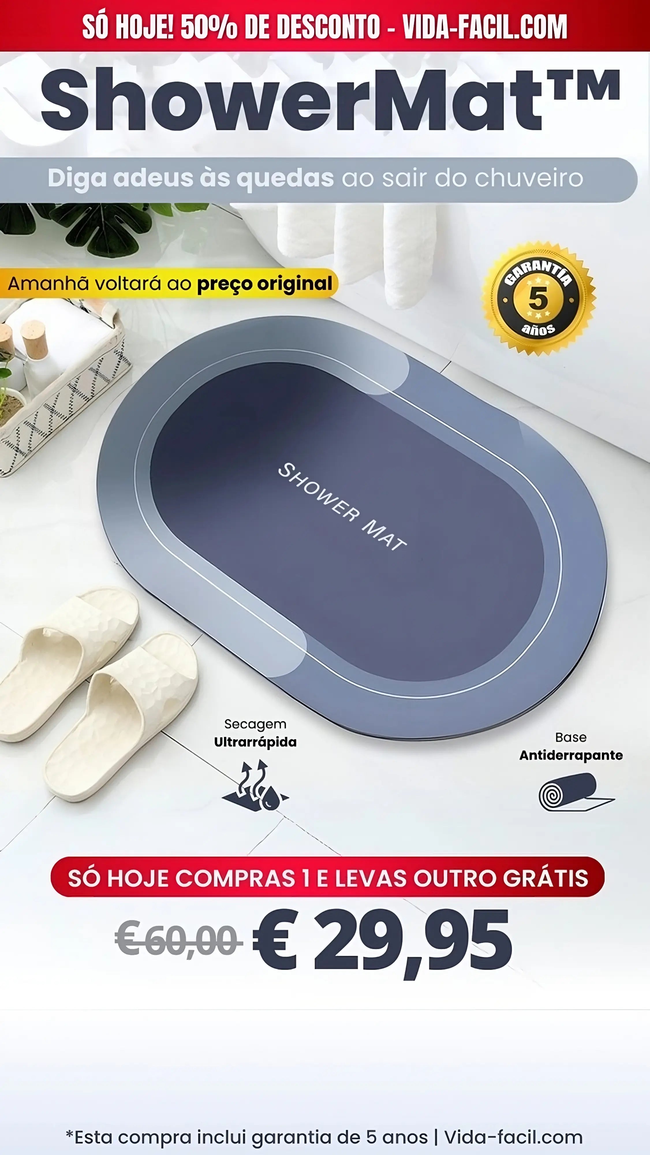 Este é o único tapete do mercado com ultra absorção, evitando escorregões e reduzindo o risco de infeções causadas por bactérias.
